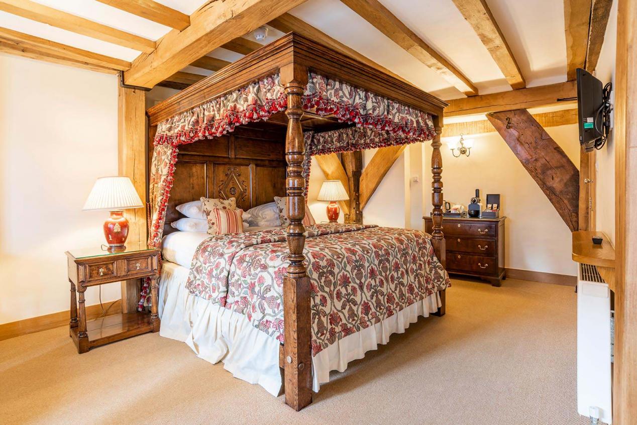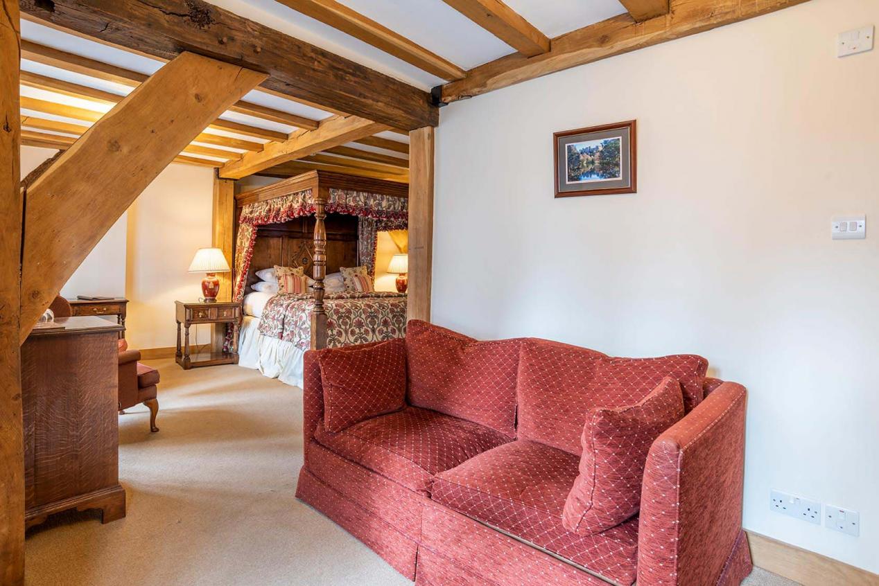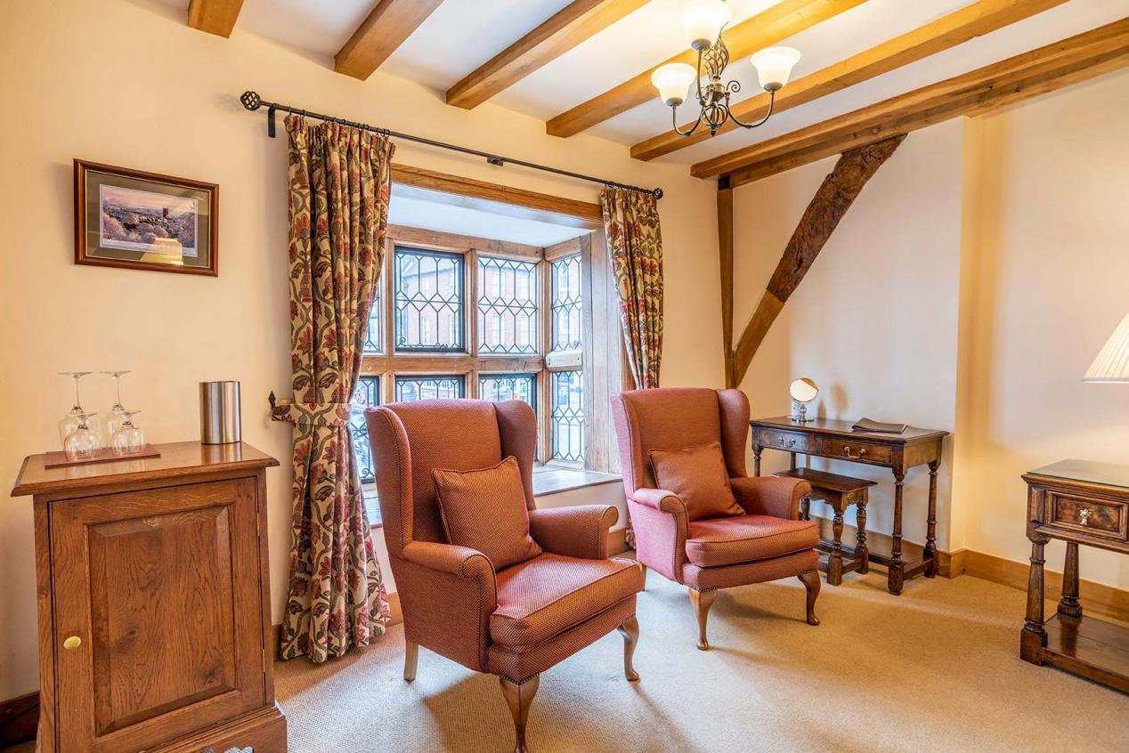 First floor spacious double room with large oak Chester style four poster bed with two double bay windows overlooking Broad Street. It has a large bathroom with bath and shower, a flat screen TV with integrated DVD player opposite the bed, and a further flat screen TV in a separate seating area. There are tea and coffee making facilities.