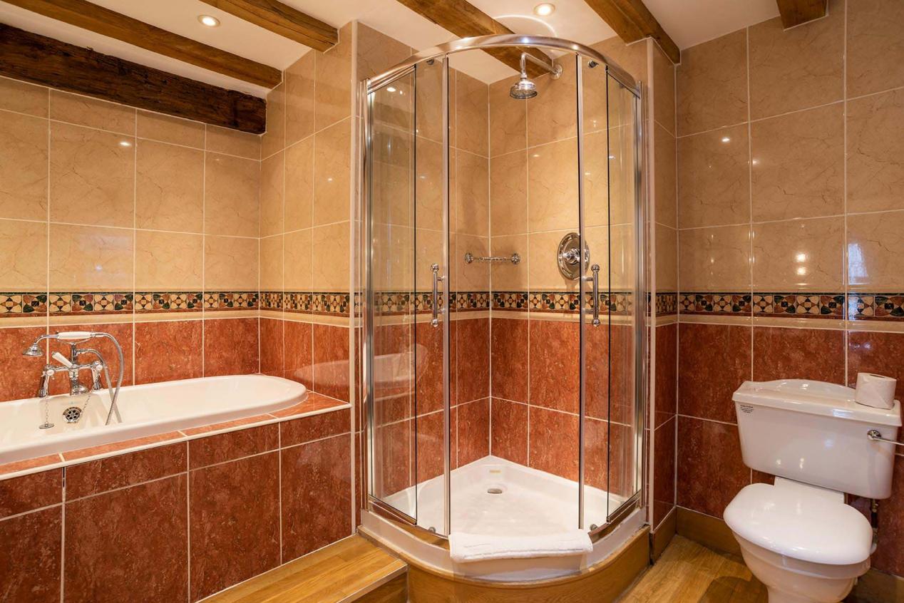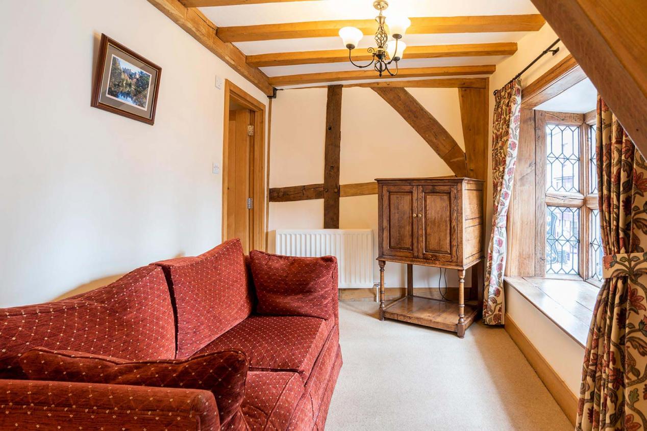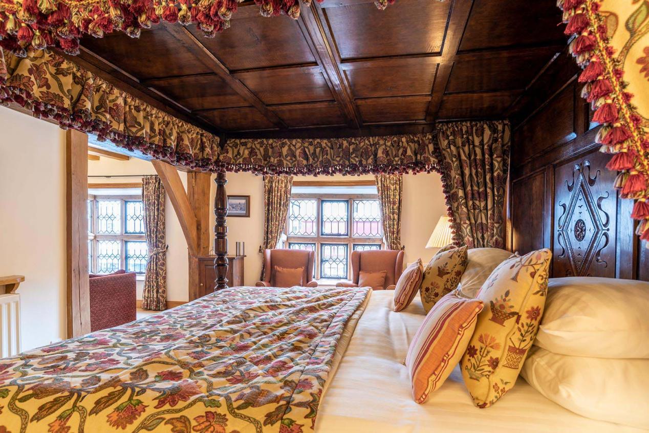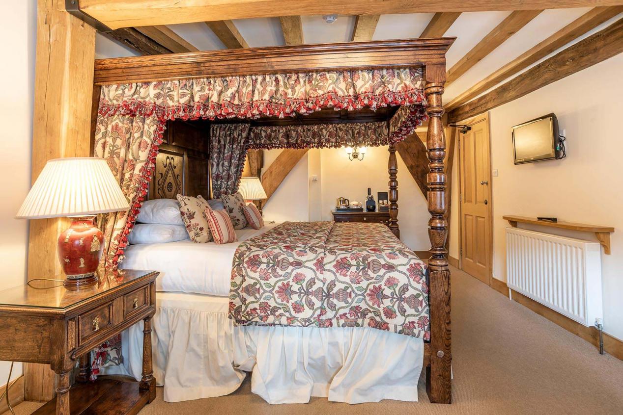 First floor spacious double room with large oak Chester style four poster bed with two double bay windows overlooking Broad Street. It has a large bathroom with bath and shower, a flat screen TV with integrated DVD player opposite the bed, and a further flat screen TV in a separate seating area. There are tea and coffee making facilities.