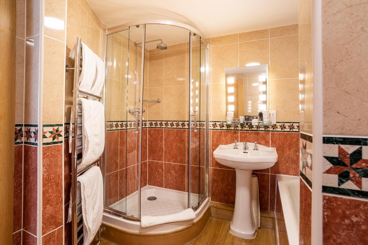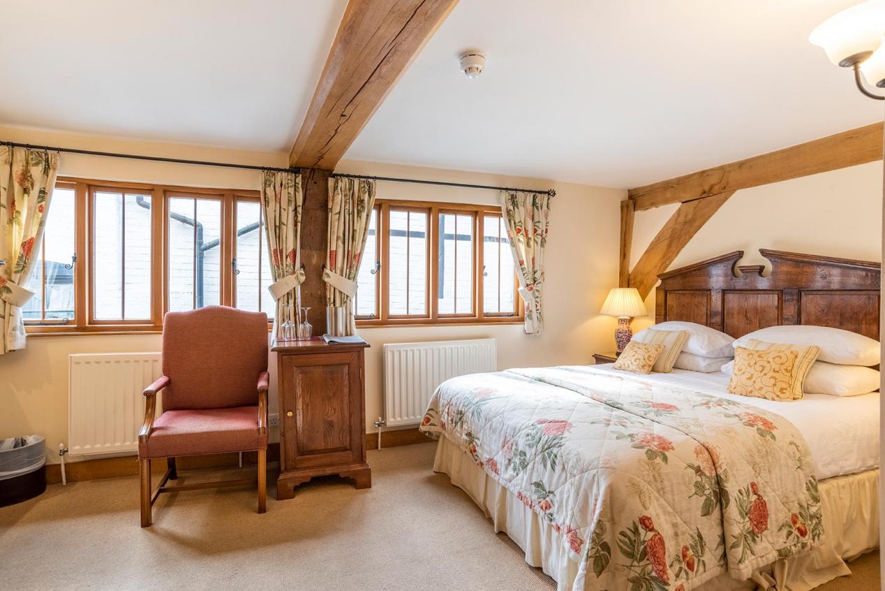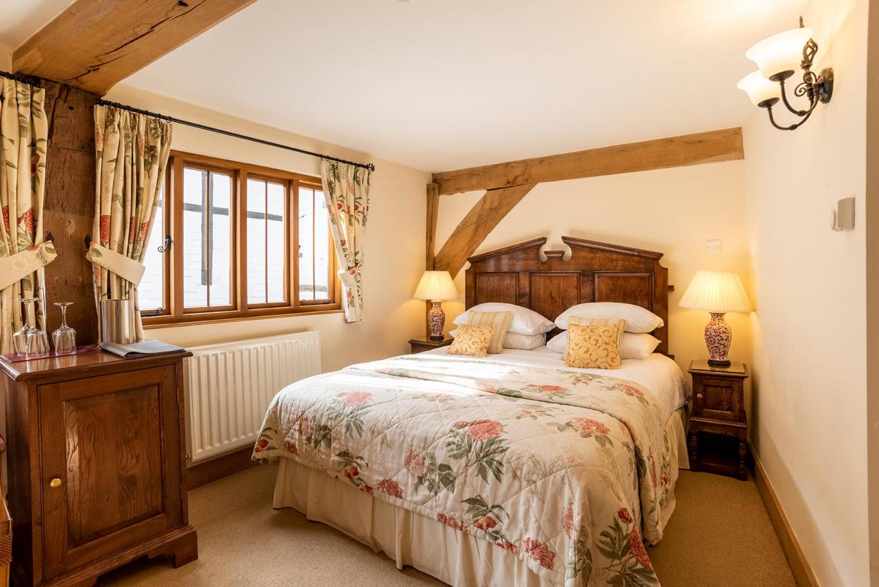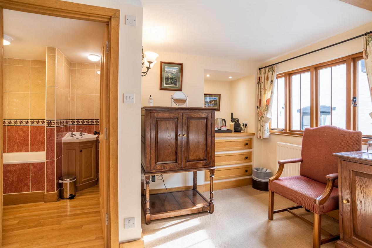 First floor double room with Georgian style headboard. It has a bath and shower, flat screen TV and tea and coffee making facilities.